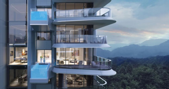 艺术大平层则配置悬挑空中私家泳池,它所带来的居住奢享感被业界认为是塔尖配置。此前誉峰的泳池楼王,便让市场铭记了十年,即使在今天,带泳池的大平层产品也屈指可数,动则千万。