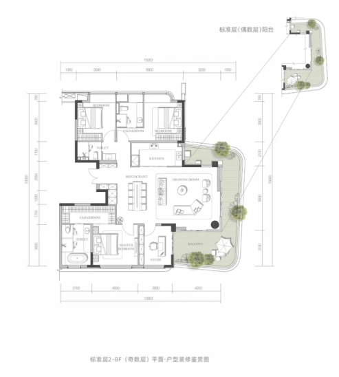 以首开的9F平墅为例,约190㎡户型,在端厅外配置了270度环幕阳台,最大宽度约3.1米。粗看数据可能无感,但和市面上大部分阳台1.8-2.4米的尺度对比,感受会更加直观,3.1米几乎是目前成都楼市已知的新宽度;