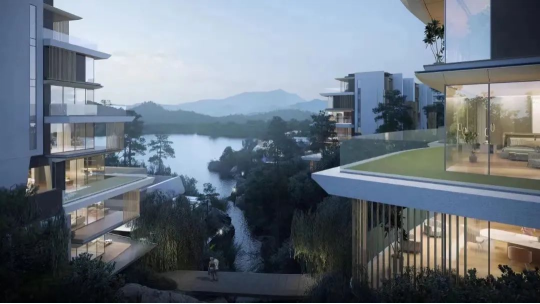 以岛为灵感,黄龙溪谷布局了塔希提组团的产品生态、建筑形态,现代原生感建筑有机生长在千亩桃源与湖水谧境间,消隐红线边界,人如同住在自然,可行,可望,可游,可居。