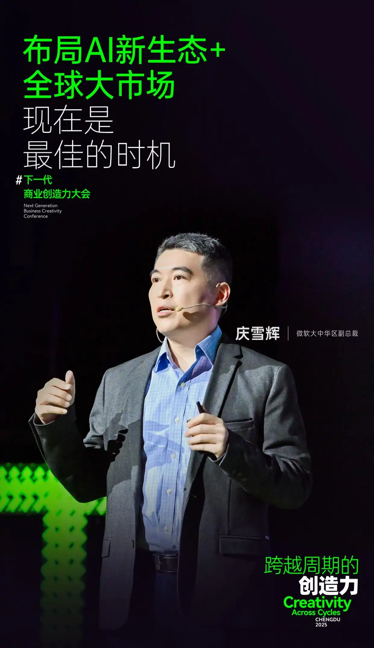 微软大中华区副总裁庆雪辉在演讲中阐述了AI技术与企业全球化发展的深、