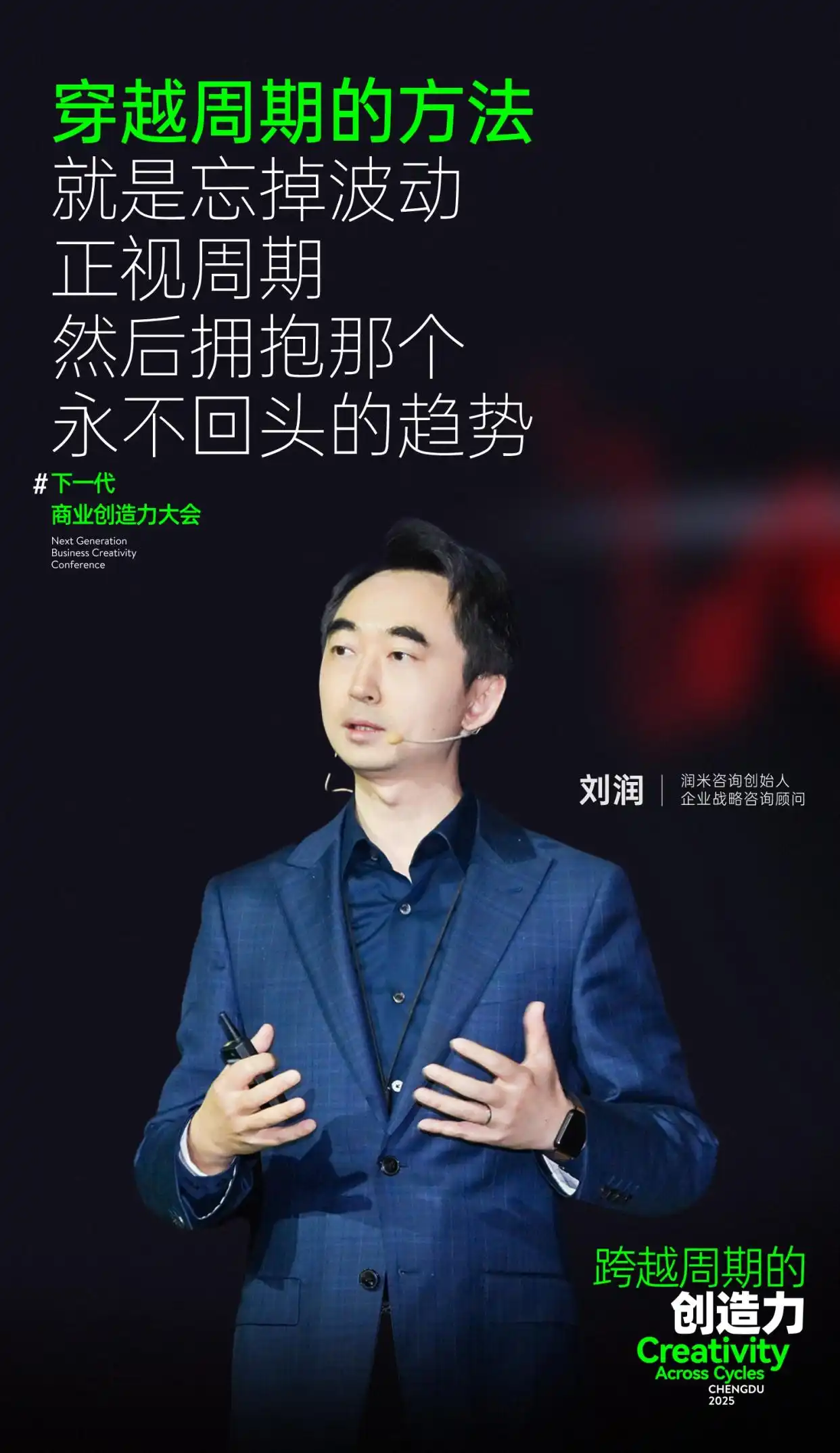 大会【潮涌篇】以"破局智慧"为核心,深度探讨企业如何在变局中把握机遇、实现突破。刘润、乐可登、刘睿三位先行者,从不同维度诠释了企业的进化之道。他们的实践证明,经济周期并非发展的桎梏,而是创新的催化剂。当企业家的远见与时代机遇相遇,必将激发出跨越周期的非凡力量。