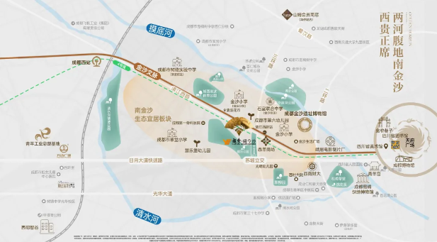 作为成都文脉发展的起源,青羊一直是成都的政枢动脉、教育高地、产业新极,而作为人文青羊源点的金沙,早在三千多年前,便是中[芯]所在,代表权力的顶点。金沙所代表的不仅是成都的“文脉”,也是集聚成都主城优质资源于一体的“贵脉”。