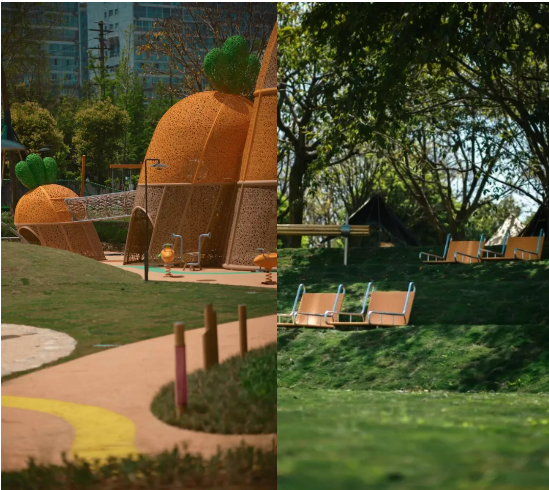 在 “兔崽子” 乐园,围绕胡萝卜造型的游戏设施尽情撒野,知识森林、阳光草毯都是他们的欢乐天地,在游戏中探索更多未知。此刻公园已不再只是一方空间,更是与人链接的生活剧场。