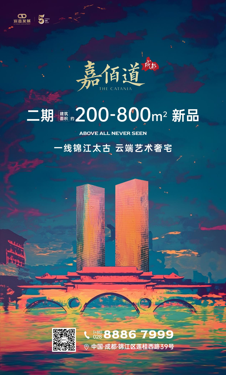 临一环,锦江畔,主城核心地段,两栋222米超高层建筑,阿玛尼设计,兰花草艺术立面……嘉佰道一期铸就的成都地标封面建筑早已成为市场共识,持续赋能着嘉佰道「顶豪赛道」的传奇。