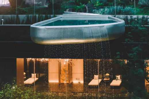 光是在归家仪式的营造上,就打造了流瀑岸迎、绮丽锦门、喷泉叠影的三重节点,进入归家门庭,穿过翡丽花径,浮现于眼前的潮汐聚场。来自世界各地的奇异花木经过园艺匠人的雕琢,呈现出一幅海屿度假风情的缦丽画卷。