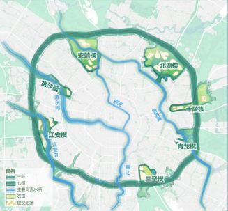 这一巨大的环形生态屏障,规划了众多楔形绿地。其中,金沙绿楔尤为特别,它从绕城一直延伸至三环,宽度可观。皆因清水河与摸底河在此交汇,两河之间的绿地被打造成公园,形成了城市优质的生态通风走廊,也让这片住宅拥有了绝佳的生态基底。