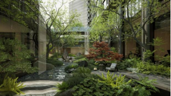 约600㎡活水庭院,约12米的高差落水,与中庭的水系相应成趣。会所整体面积约2000㎡,再结合约400㎡的泛会所,户均会所面积高达约10.5㎡/户,远远超过了主流的配置标准。