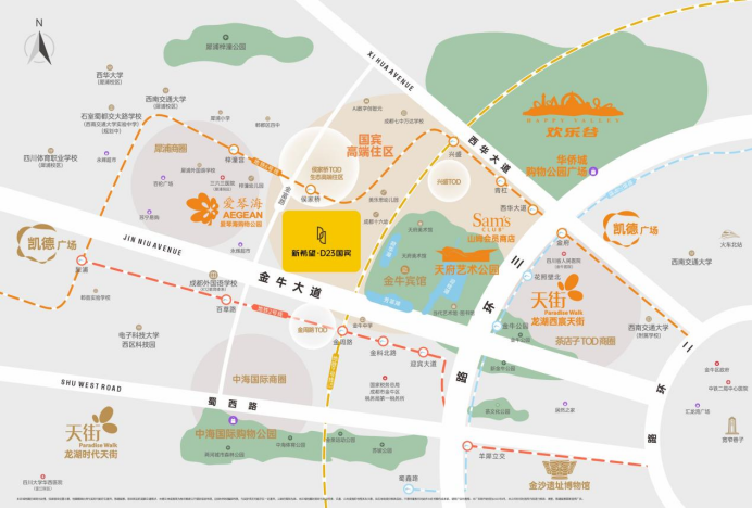 新希望D23国宾区位示意图 项目坐落于金牛大道旁,通过“国宾中轴”高效承接茶花片区西宸天街商圈、华侨城山姆会员店及犀浦商圈等重要商业资源。同时,项目毗邻侯家桥TOD(直线距离约400米),并与成都外国语学校K12教育资源相邻,共同构建TOD超级都会生活圈。 在产品层面,D23国宾延续新希望高端产品系的基因,标配一体化玻璃幕墙、星级酒店式归家系统及品牌会所。在此基础上,项目对架空层景观进行系统升级,引入更高标准的会所品牌合作,并结合新规政策在户型设计中积极探索创新,优化空间实用性和功能布局,提升整体居住体验。 在国宾板块全面向新发展的时代背景下,新希望D23国宾的到来将从迭代居住产品和高奢生活方式为区域人居迭代注入新活力,拉开国宾居住焕新的时代序幕。