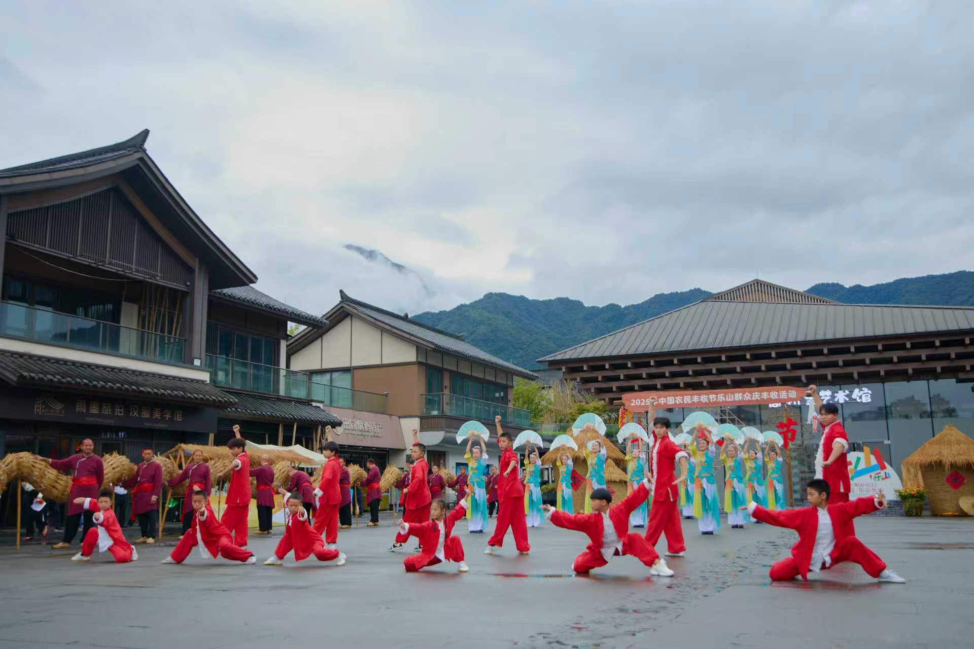 作为本次活动的主会场,高桥里以其卓越的运营能力和独特的文化魅力,为丰收节打造了一场沉浸式的文旅体验盛宴。巧妙地将2388亩自然秘境转化为一个没有围墙的“自然剧场”,打造了一场“望得见山、看得见水、记得住乡愁”的巴蜀农耕盛宴。这里梯田作舞台,稻浪为背景,山谷成看台,为丰收节提供了独一无二的沉浸式体验空间。从非遗展演到歌舞表演,从农事体验到特色展示,高桥里通过“一景一演、一站一品”的动线设计,充分展现了乐山农业农村发展的新成就和乡村振兴的新面貌。