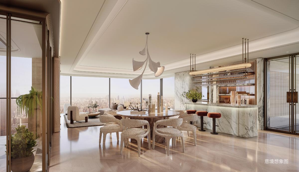 跳出符号化表达的建筑语境,项目以纽约曼哈顿地标建筑前沿创新的风格为蓝本,创新打造“无界超流体”立面。采用极简线条语言,摒弃传统建筑厚重的墙体阻隔,通过大幅面玻璃应用和精细化结构设计,实现视觉张力;通过多个弧形转角low-E玻璃, 以“半弧线”展现面向城市的“环抱之姿”,与区域地标同频共振构建国际化审美风范。