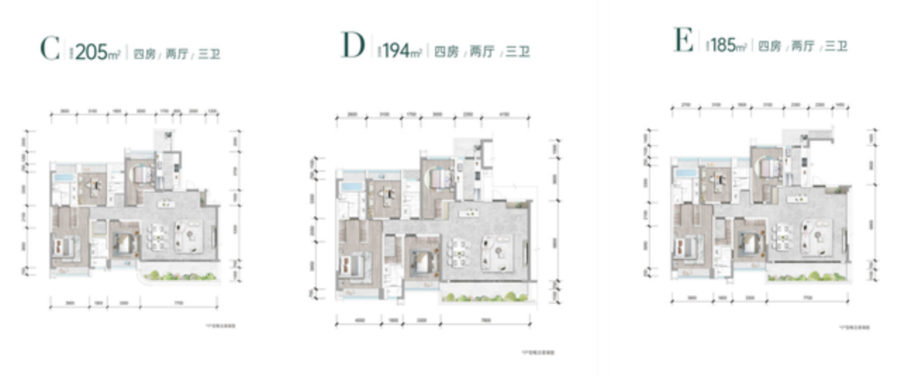 购房者较为关注的185、194、205三大户型,均是四房两厅三卫,整体格局相似,尺度更为阔绰且分区明显,均有中西双厨设计;还有双套房设计,在给到长辈足够尊重的同时完美解决三代同堂的家庭所需。