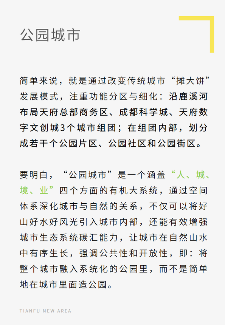与传统的生态城市、花园城市、森林城市等理论不同的是,“公园城市”强调着“人、城、境、业”的高度和谐统一、强调着城市与人类的可持续未来。